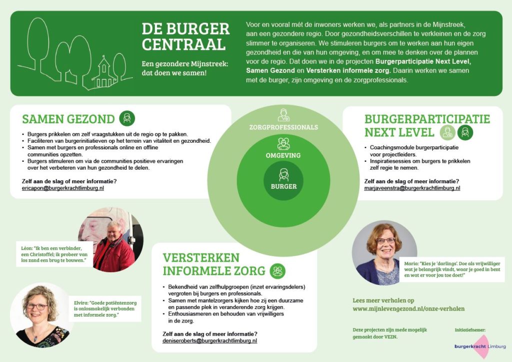 Met verschillende initiatieven zoals ‘Burgerparticipatie Next Level’, ‘Versterken informele zorg’ en ‘Samen Gezond’ zorgen we dat de inwoner centraal staat in onze samenwerking. Deze initiatieven worden begeleid door Burgerkracht Limburg en mede mogelijk gemaakt door CZ namens alle zorgverzekeraars. In het overzicht hier links een beknopte samenvatting van deze initiatieven.