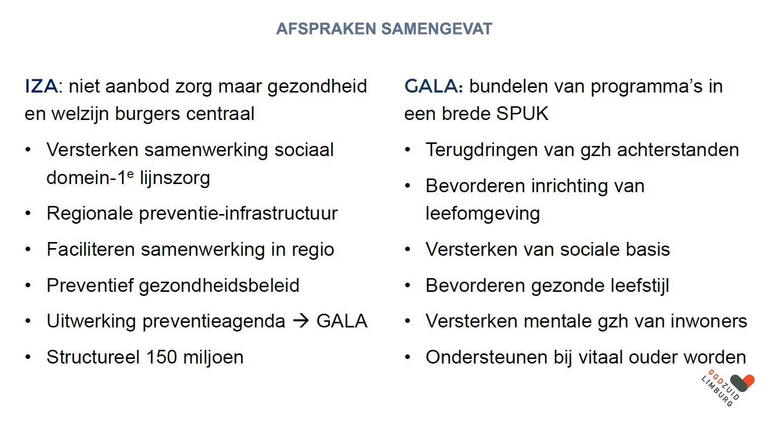 Met bundeling van middelen in één brede financieringsregeling (de zgn. SPUK-A gelden) krijgen gemeenten een stevigere basis om integraal preventief gezondheidsbeleid te voeren. De verbinding gezondheid, preventie en versterking sociale basis/leefomgeving kan een belangrijke bijdrage leveren aan het terugdringen gezondheidsachterstanden. Met Trendbreuk, de regionale gezondheidsnota van 16 gemeenten en de Mijnstreek samenwerking is al een belangrijke beweging in gang gezet. Bert is hoopvol dat IZA en GALA én het akkoord rondom wonen en zorg voor ouderen (WOZO) de komende jaren een forse impuls geven aan lokale en regionale samenwerking rondom maatschappelijke opgaven die leiden een gezondere samenleving. De afspraken IZA en GALA heeft Bert krachtig samengevat in onderstaande overzichten. Download onderaan deze pagina de hele presentatie van Bert.