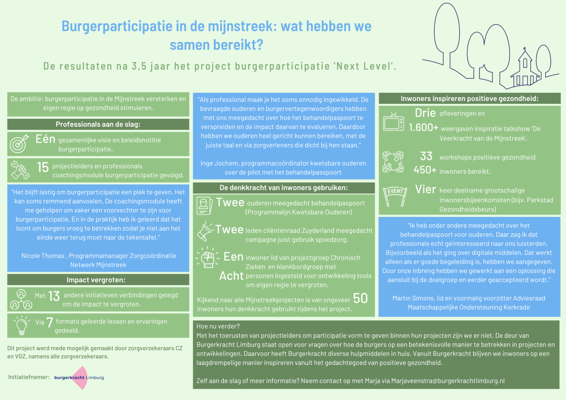 “Er is heel veel bereikt, maar hiermee zijn we er nog niet”, geeft Marja Veenstra, projectmanager bij Burgerkracht Limburg aan. “Het biedt zoveel kansen en het werpt wel degelijk zijn vruchten af. Zeker na uitrol van het project. Maar toch blijven we zien dat het betrekken van burgers een lastig onderdeel kan zijn.” Verder lezen? Lees het interview met Marja op de website van Burgerkracht Limburg.