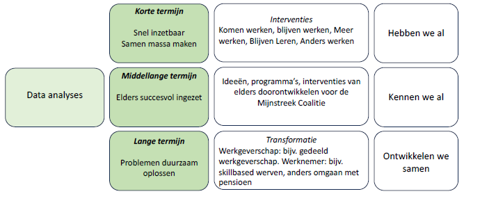 Voor de korte termijn zijn dat interventies die zich al hebben bewezen, die we snel kunnen inzetten en effect sorteren. Bij de middellange termijn ligt de focus op het adopteren van successen die elders zijn geboekt, en die we vervolgens op maat maken voor de regio. De lange termijn vraagt om grotere transformaties die bijdragen aan een duurzame oplossing van de regio-opgave.