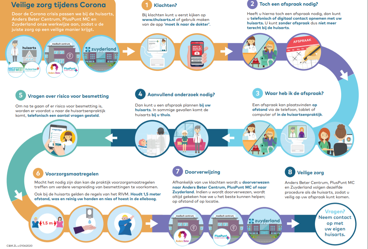 Alle huisartsen in de regio, Anders Beter Centrum, PlusPunt Medisch Centrum en Zuyderland slaan de handen ineen voor de meest veilige zorg in tijden van corona. Samen hebben ze hun werkwijze aangepast, zodat iedereen de juiste zorg op een vertrouwde manier krijgt. Er is samen een infographic en een animatie ontwikkeld waarin alle stappen die je zelf kan doorlopen, staan beschreven.Â