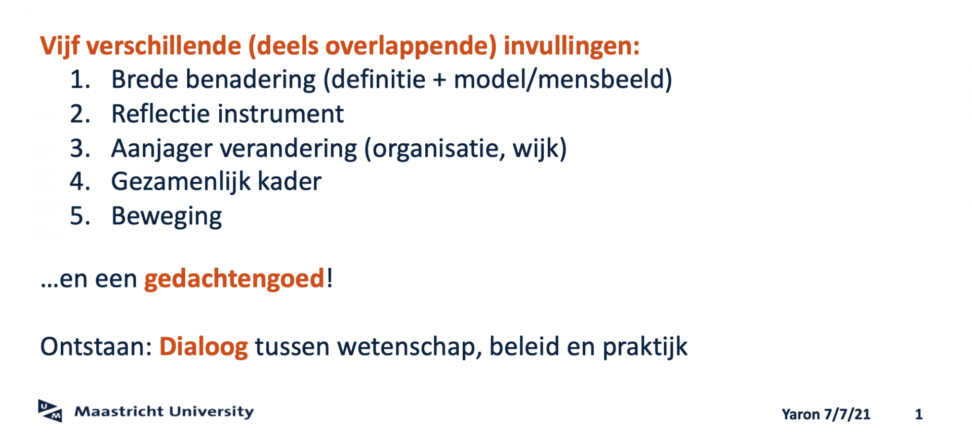 Na een introductieronde waarbij deelnemers een-op-een spraken over hoe zij het werken met Positieve Gezondheid (PG) in de eigen organisatie of project vormgeven, vertelde dr. Gili Yaron (UM) over haar onderzoek. Een centrale bevinding hierbij is dat betrokkenen PG op vijf verschillende manieren invullen (zie afbeelding).
